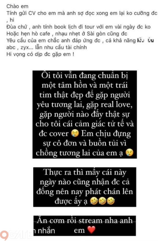 Theo đó, nữ streamer Hà thành từng đăng tải công khai một bức thư điện tử với nội dung chào mời cô nàng "đi tour" với các hoạt động như cùng nhau hẹn hò, nhậu nhẹt và ăn chơi, đổi lại nữ streamer có thể được đáp ứng hết những yêu cầu từ tình đến tiền miễn là cô thích. Và động thái sau đó của cô mới thấy cô nàng phải bản lĩnh, quyết liệt trước những cám dỗ của nghề như thế nào.