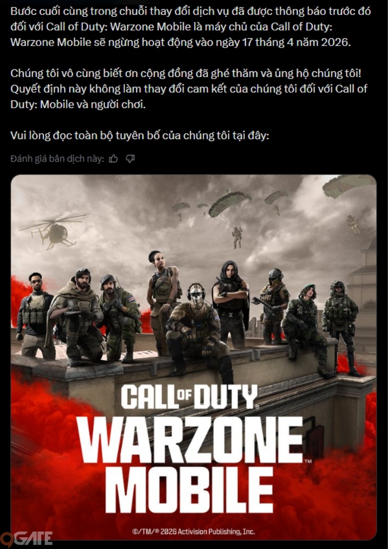 Sau nhiều đồn đoán và thông tin rò rỉ suốt thời gian qua, việc Call of Duty: Warzone Mobile chính thức ngừng hoạt động đã trở thành sự thật. Theo xác nhận mới nhất từ Activision, máy chủ của trò chơi sẽ bị tắt hoàn toàn vào ngày 17/4/2026, đồng nghĩa với việc mọi tính năng trực tuyến, ghép trận và hỗ trợ người chơi đều chấm dứt vĩnh viễn. Sự kiện này không chỉ đánh dấu dấu chấm hết cho một dự án được kỳ vọng rất lớn, mà còn để lại không ít tiếc nuối trong cộng đồng game thủ mobile trên toàn thế giới.