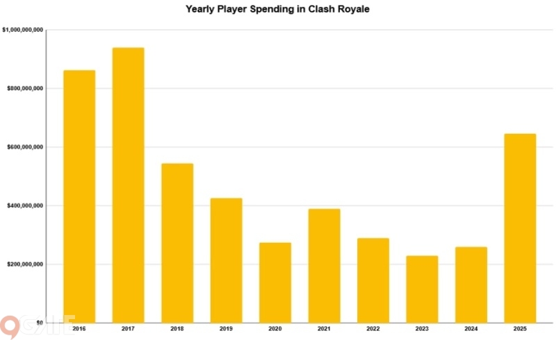 Ngay trong năm đầu tiên, Clash Royale đã đạt doanh thu ấn tượng lên tới hơn 862 triệu USD. Sang năm 2017, con số này còn tăng mạnh lên 940 triệu USD, đánh dấu giai đoạn bùng nổ của tựa game trên thị trường toàn cầu. Theo ước tính từ các nền tảng phân tích dữ liệu, tổng doanh thu trọn đời của Clash Royale hiện đã vượt mốc 4,9 tỷ USD trên cả Google Play và App Store.