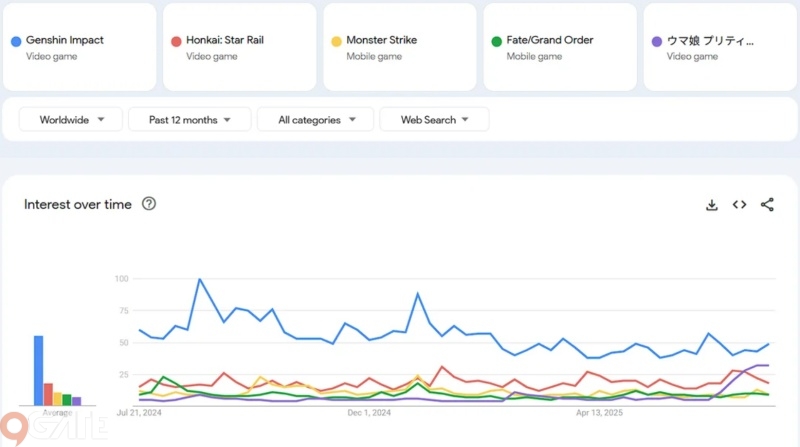 Theo Google Trends, Genshin Impact đạt điểm trung bình 55 – cao vượt trội so với bất kỳ đối thủ nào cùng bảng. Điểm cao nhất trong giai đoạn 2 năm trở lại đây thậm chí chạm mốc 100, cho thấy những đợt cập nhật lớn hoặc sự kiện in-game đã kéo lượng tìm kiếm tăng vọt. Việc dùng Genshin làm chuẩn mực trong so sánh khiến mọi game còn lại đều bị "thu nhỏ" đáng kể. Ví dụ, Honkai: Star Rail – một tựa game cùng nhà phát hành HoYoverse, chỉ đạt điểm trung bình 18, tức chỉ bằng 1/3 độ phổ biến của Genshin.