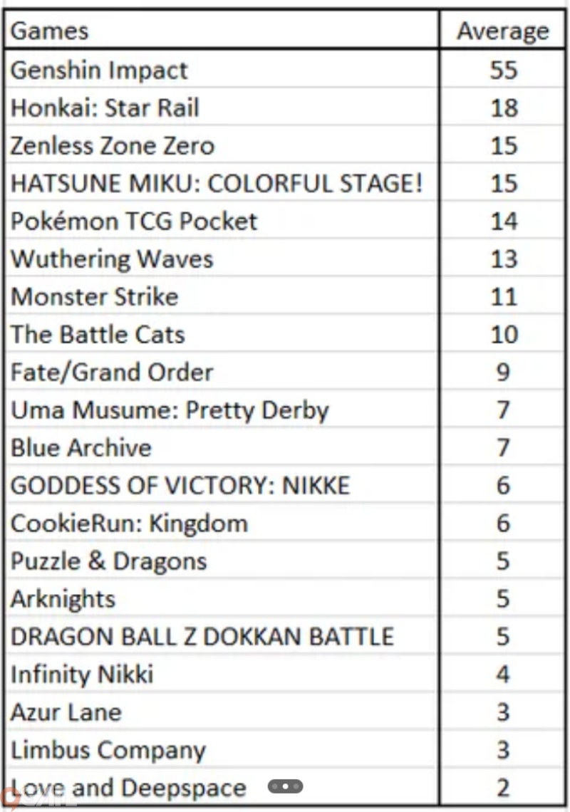 Các tựa game như Pokémon TCG Pocket (14), Wuthering Waves (13) hay Monster Strike (11) vẫn giữ được phong độ ổn định, trong khi các tượng đài như Fate/Grand Order (9) hay Uma Musume: Pretty Derby (7) dường như đang dần giảm sức hút bên ngoài Nhật Bản. Việc Google Trends không thu thập dữ liệu từ Trung Quốc cũng khiến nhiều tựa game phổ biến tại thị trường này bị đánh giá thấp hơn thực tế – điển hình là Love and Deepspace hay Limbus Company chỉ đạt mức trung bình 2-3.