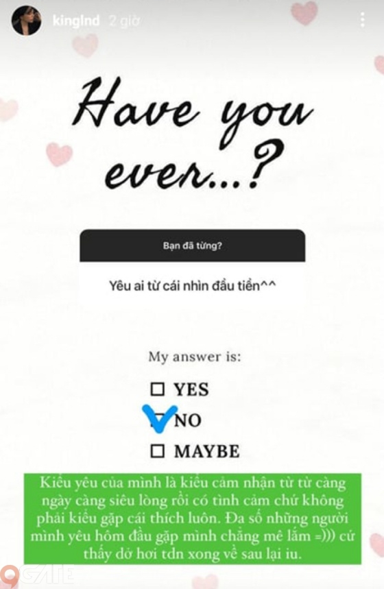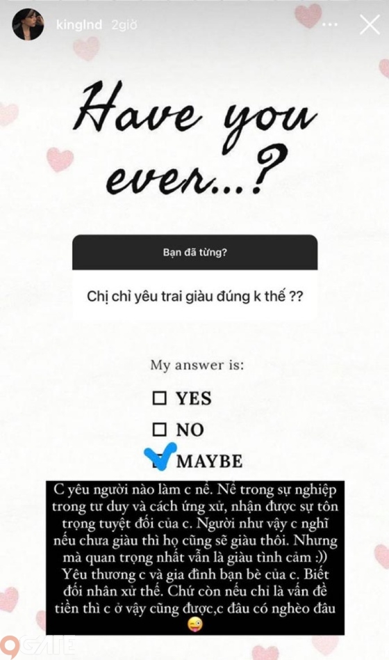 Ngoài ra, trước câu hỏi về vấn đề đã bao giờ “lụy tình”, nữ streamer thú nhận rằng đã từng đau khổ vật vã nhưng chưa bao giờ tỏ ra níu kéo hay quỵ lụy bất kỳ ai: “Từ bé luôn, xin bố mẹ không cho là không bao giờ mè nheo lần 2. Có thể do tính cách bản năng mạnh mẽ hoặc do mình luôn lạc quan tự tin rằng cái gì mình không có được thì mình sẽ gặp cái khác tốt hơn”.