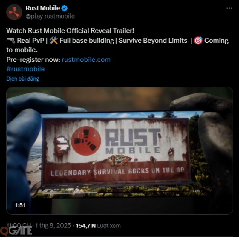 Sau thời gian dài chờ đợi, Rust Mobile – phiên bản di động chính thức của tựa game sinh tồn nổi tiếng Rust, cuối cùng đã bắt đầu cho phép đăng ký trước trên cả Android và iOS. Được phát triển bởi Level Infinite, công ty con của Tencent Games và cấp phép trực tiếp từ Facepunch Studios, Rust Mobile hứa hẹn sẽ mang lại trải nghiệm sinh tồn khốc liệt, đậm chất sandbox và PvP ngay trên thiết bị di động.