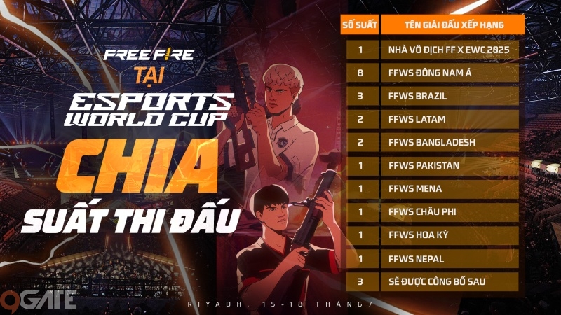 Thêm vào đó, Free Fire đã xác nhận sự tham gia của mình tại Esports World Cup 2026, với sự kiện diễn ra từ ngày 15 đến 18 tháng 7 tại Riyadh, Ả Rập Xê Út. Tổng cộng 24 đội tuyển hàng đầu từ khắp nơi trên thế giới sẽ tranh tài tại năm thứ 3 của Free Fire tại Esports World Cup 2026. Giải đấu sẽ quy tụ các đội tuyển Free Fire xuất sắc nhất thế giới thi đấu trên đấu trường toàn cầu, bao gồm nhà vô địch Free Fire x EWC 2025 - EVOS Esports, 8 đội tuyển từ FFWS SEA 2026 Mùa Xuân, 3 đội tuyển từ Brazil, 2 đội tuyển từ LATAM, 2 đội tuyển từ Bangladesh, cùng với 1 đội tuyển từ mỗi khu vực Pakistan, MEA và Nepal, với thêm nhiều suất tham dự sẽ được công bố sau.